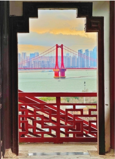 龟猴子园内,城市书斋的红色阁楼与鹦鹉洲长江大桥互相衬托。