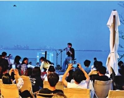 晚风中响起蓝调旋律——东湖凌波门临湖栈谈缀满星星灯串,歌手在现场歌咏,背后便是东湖。“这里的氛围太棒了,一边观赏音乐会,一边感受东湖的微风,唾手拍都是文艺大片。”举入辖下手机拍视频的大学生小论说,“我且归后要把这些视频作念成Vlog,记载这段好意思好的时光。”