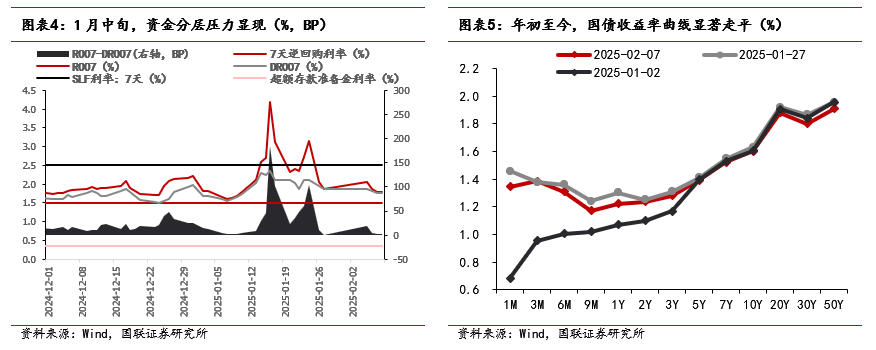 2025年1月资金面先松后紧。1月初,由于跨年流动性援手相对充裕,资金面较为宽松,DR007加权柄率一度看护在接近1.6%的较低水平。筹商词,1月10日起,央行告示暂停公开市集国债买入操作,辅导国债投资风险并起先稳汇率,对短端利率有所扰动;同期跟着月中税期周边,重叠春节取现压力逐步分解,资金需求逼近在月末时点,且大行融出意愿回落至弱于季节性的水平,导致资金面在1月下旬彰着收紧。
