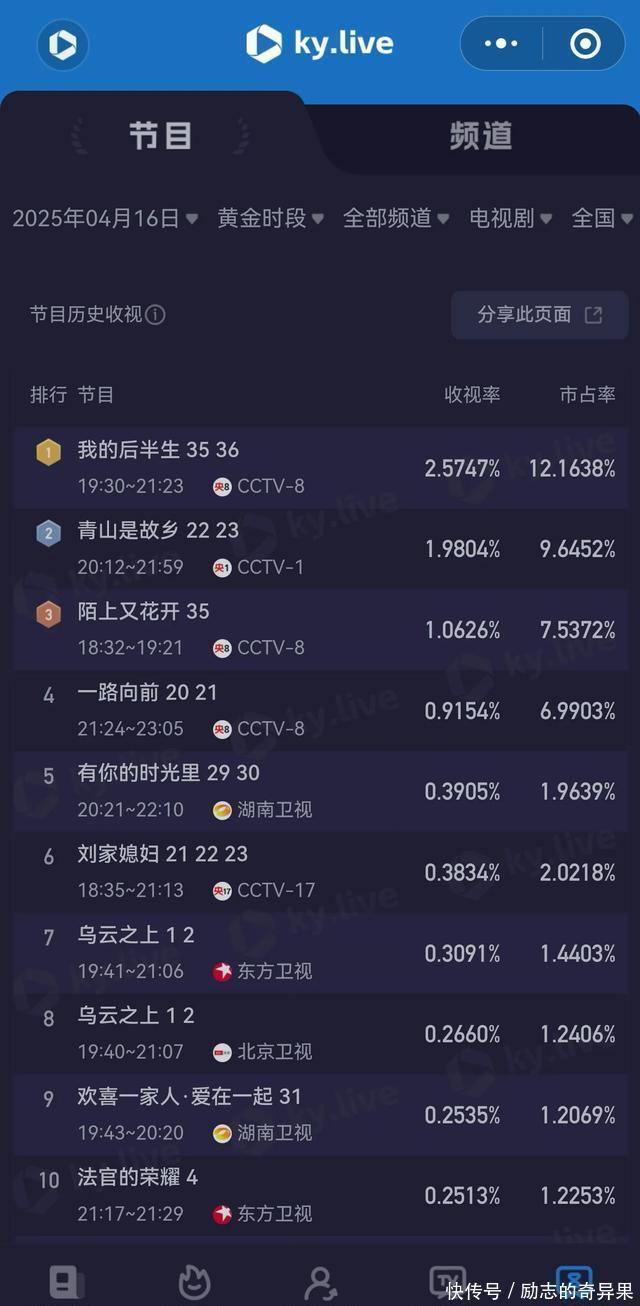先来聊聊最近刚截止的热点剧《我的后半生》。这部剧在收视率上进展不俗,以2.5%的获利画上了句号。紧接着,《青山是桑梓》和《陌上花又开》也紧随后来,分歧夺得了收视榜的第一和第二名。这可见不雅众对这些故事情节和扮装发展的敬爱。